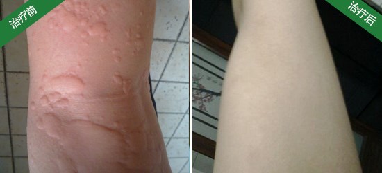 荨麻疹治疗过程:左先生腿上荨麻疹面积大,采用中药和外用熏蒸的方法,把体内的过敏原清掉,再通过中药调理,益气固表,疏风清热,使体内达到阴阳平衡,康复后病情没有复发。