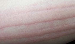 病症:皮肤发痒、用指甲划过后,局部先出现一道道的红斑风团,随即风团水肿高出皮肤,并在红斑风团的边缘出现红晕现象。